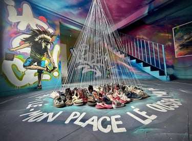 Au 1er étage, L'1DI1 investit l’espace avec une installation artistique intitulée qui questionne les liens entre origines et appartenances, avec un attachement fort à La Réunion. Dans la pièce centrale, des chaussures forment une carte de l’île et évoquent des présences, des histoires, des identités avec des fils tendus reliés à un point unique, qui figurent les liens à nos racines et entre chacun de nous. Dans les espaces annexes, deux fresques murales révèlent des peintures sur toile pouvant s’en détacher et exister comme œuvres autonomes, porteuses de leur propre récit tout en conservant la mémoire de leur source.