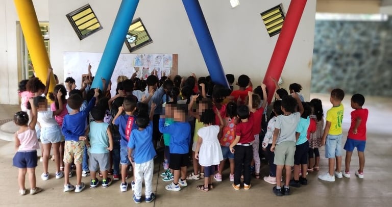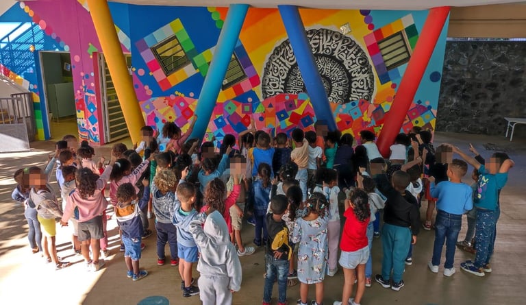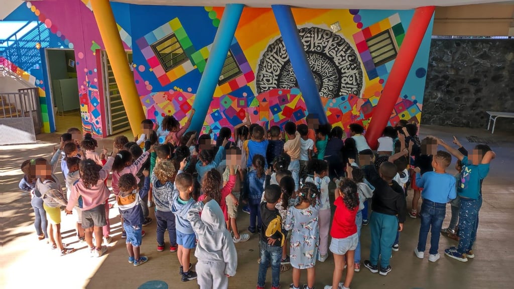 « Les couleurs de ma cour » est un projet de grande ampleur, coconstruit par l’école maternelle Ann-Mary Gaudin de Lagrange à Sainte Marie et l’artiste peintre graffeur L’1DI1, dans le cadre du parcours d’éducation artistique et culturelle (PEAC), à destination de 83 élèves (2 classes de petite section et 2 de grande section), réalisé sur la période d’avril à juin 2024 et qui a abouti à la réalisation par les enfants d’une fresque sur les murs de la cour de l’école.